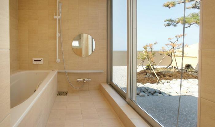 湯船に浸かりながら、水平線を借景とした石庭を眺めることができます。日常の中にある、静かで贅沢な時間です。