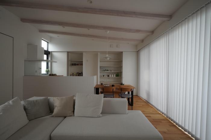 キッチンの背後には、たっぷりの造作収納を設けました。日々使うものをすっきり収められるので、生活感を抑えたシンプルで整った空間を保つことができます。片づけがしやすく、気持ちよく暮らせる工夫が詰まっています。