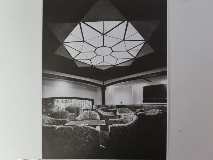 ステンドグラス、その周辺はエーゲ獅子の柄によるクロス貼りとし雰囲気を締めている。壁はスタッコ塗とし単純化している。床は勲章柄の毛足の長いじゅうたんとしゴブラン織りの椅子と調和しすべて特注でまとめた。特に管理面でこのスペースを独立させ本館との連結をしやすくしている。