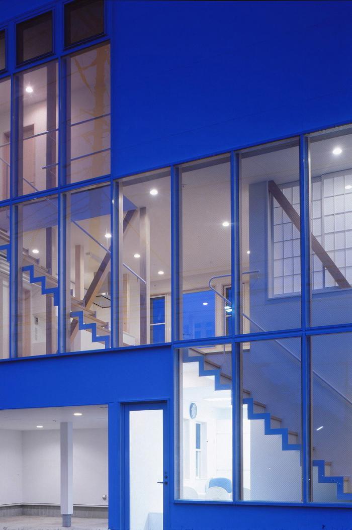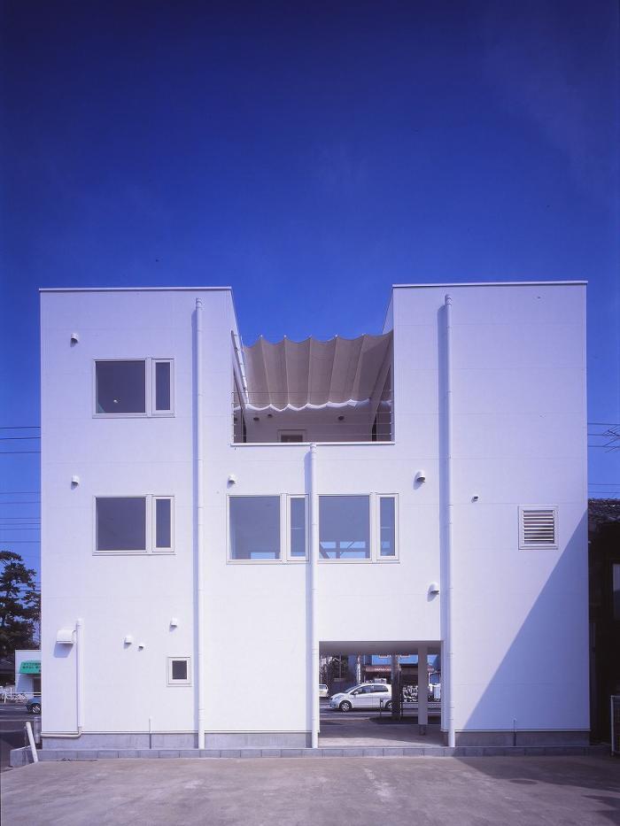 国道部分の拡幅に伴う事務所併用住宅の建て替えである。 1階はオーナーの事務所と駐車場、2・3階が住居である。 北側を走る国道以外、三方向を隣地に囲まれた近隣商業地域の狭小敷地であるため、各居室に対し採光・眺望をどう確保するかがテーマとなった。