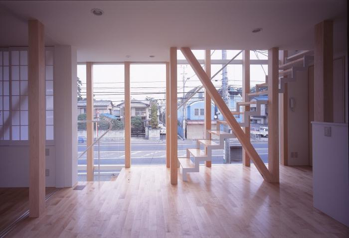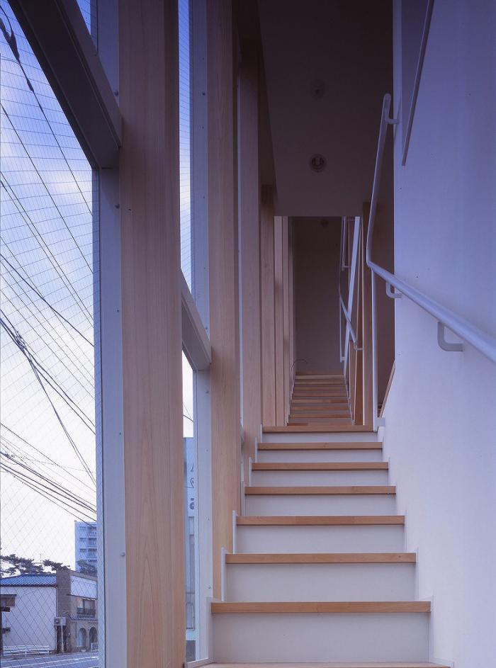 まず、北側の国道に面し大きな開口部を配し、バッファーゾーンとしての階段を通して、2階居室への柔らかい採光と眺望を求めた。 北側に大きな開口部をつくる手法はしばしばアトリエなどに用いられ、柔らかい光は室内に眩しさ・高温・陰をつくらず、実はとても居心地が良い。 次に、3階は南側バルコニーで外部空間を取り込み、そこから居室への採光を確保した。 現在、敷地の南・西側はカーディーラーの駐車場となっているが、将来に渡り居住性が確保されている。