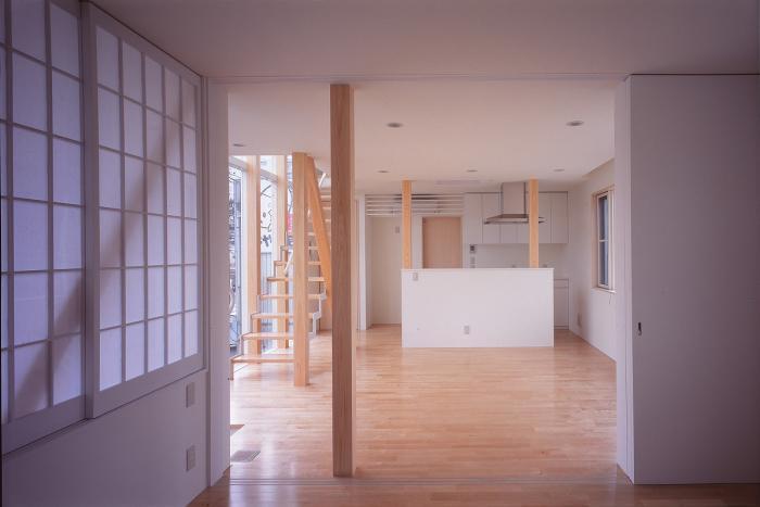 2階リビング・ダイニングはバッファーゾーンとしての階段を挟んで北側国道に開放されている。 2階寝室は階段と更に障子を挟んで国道に面し、3階寝室は国道に背を向けている。 各居室のプライバシーの求められ方に合わせて国道との関係を規定している。 家の中のパブリックゾーンは階段を挟んで街に開放されているが、実際は外部からの視線をロールスクリーンでコントロールしている。