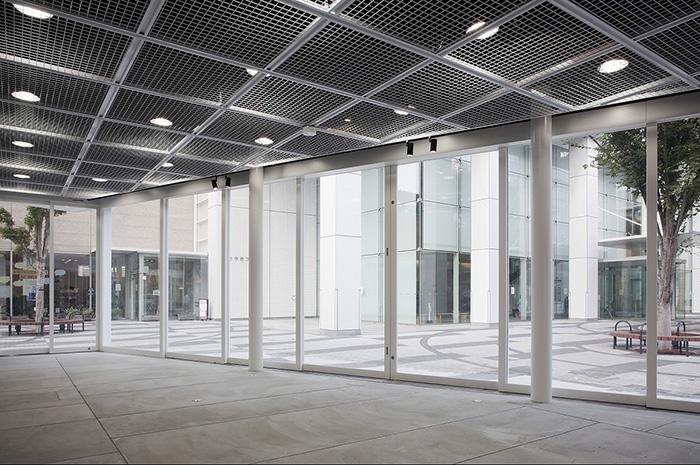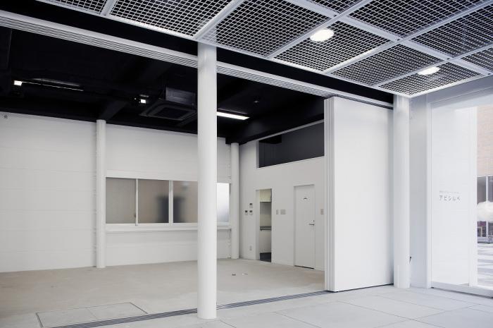 展示室では日常的にパネルやモニターによる展示・パンフレットの配布等を行っているが、この施設自身でイベントを行えるように、 プロムナードに対し、サッシを全解放できるようにした。展示室をステージに、プロムナードを客席に見立て様々なイベントが催せるよう計画した。
