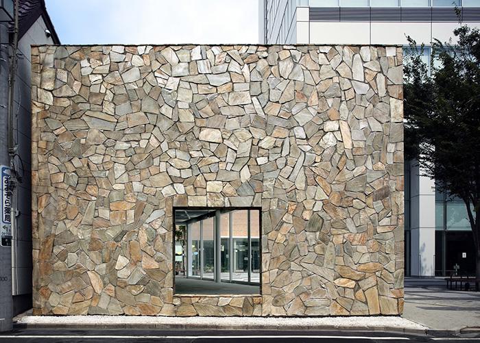 この建物の主要構造は鉄骨フレーム構造であるが、市道側の寡黙な表現を石貼りとしたことを契機に、その壁と更にそれに平行なピクトグラム「i」のある壁をRC造の耐力壁とした。更に、それらに直行方向の架構は鉄骨ブレースを付けることにより、それぞれ違う形式で水平力を分担した。
