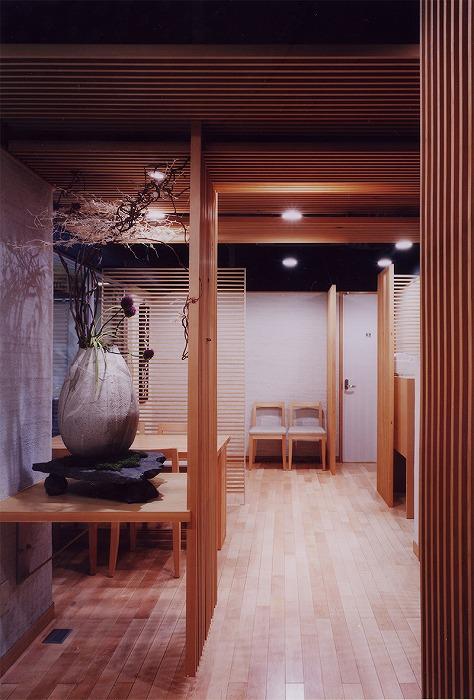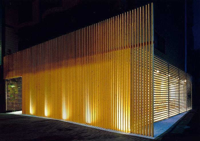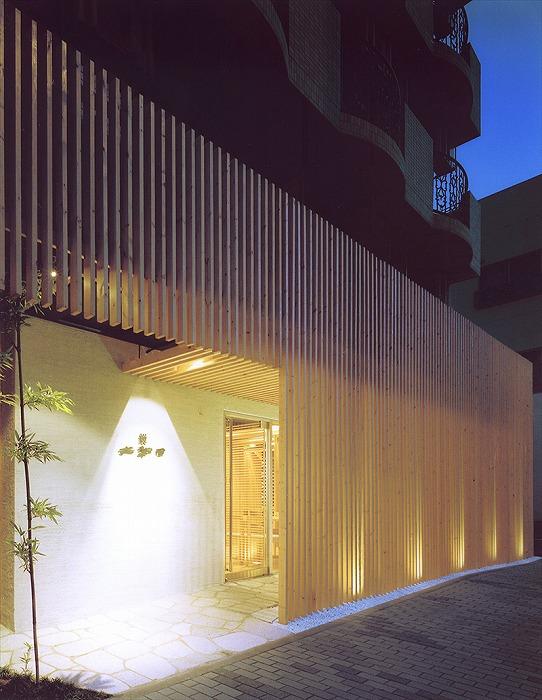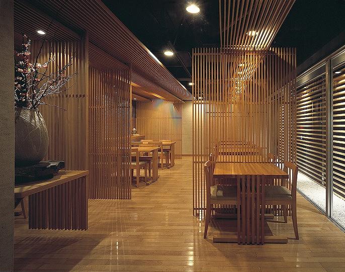 店舗全体を竪格子のみで構成すると、空間が単調となり、また、和風の印象が強くなり過ぎることから、竪格子と横格子を併せて 用いることとした。また、竪格子は同じ横格子に較べ遮蔽性を強く感じることから、国道沿いに竪格子、側道沿いに横格子を配した。 更に、店舗内部も格子で構成するものとし、スケール感に対応した細かな格子で竪・横を外部に合わせて配置した。 「格子の重層」を空間表現のベースと設定した。 また、内部格子の一部を可動とし、自由度の高い客席レイアウトを可能とした。テーブル脚部も格子の表現とし、空間構成に積極的に参加した。