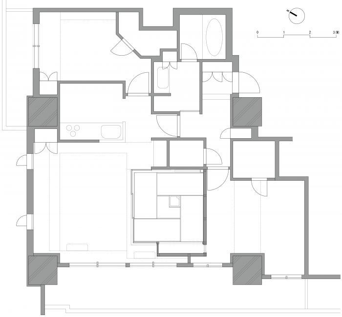 元々リビングに面した部屋の壁と引戸を解体し、サッシやエアコンは活かしつつ、リビングに対して障子で開いたり閉じたりできる構成の茶室とした。既存の窓を活かすため、部屋の中にまた部屋がある入れ子状の構成とした。障子を閉めれば客室としても使える茶室であり、障子を取り外せばリビングと連続する小上がりの和室でもある。取り外した障子は行燈照明側の敷居と鴨居に収納しておく事もできる。