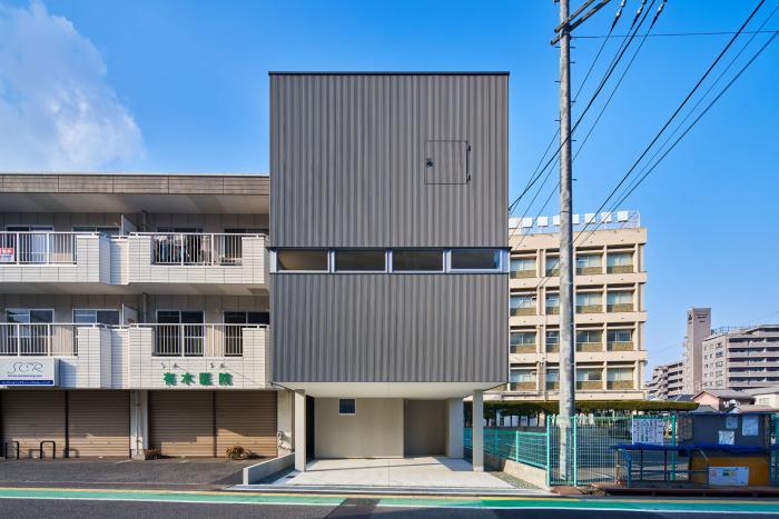 敷地は駅からほど近く、周囲を住宅やマンションに囲まれた場所。ここで求められたのは「明るく、居心地の良い家」だった。東側に公共施設の青空駐車場が広がり、明るさを取り込むには好条件だが、人や車が頻繁に出入りするこの方向に大きな窓を設けるのは、明るさを得ることよりも他に得られないものの方が大きい気がした。光を取り込み、風を通し、室内を開放的にするため、内外の境界として窓が必要になるが、壁を大きくくり抜く窓は、外部環境を享受する代わりに外部にとっても内側の存在をはっきりと認識させてしまうことになる。その結果として都市住宅では昼夜問わずカーテンが閉められ、周囲に閉じているというメッセージを放つことになる。そこで、この建築では窓の持つオブジェクトとしてのメッセージ性を捨て、生活の背面にそっと佇む”単純機能としての窓”として扱うことで豊かさを作り出せないかと考えた。単体の四角い窓を部屋ごとに点在させるのではなく、建物をぐるりと囲った細長いスリット窓から天井や壁を伝いながら柔らかな光が入って来り、バルコニーの内壁に反射した優しい光が窓を通って室内を包み込む。行き止まりの無い回遊型の平面プランも光や風を建物の奥まで運んでくれる。風景を切り取るなどの美的な性質を持ち合わせていない、通風・採光だけを期待された単純機能の窓だからこそ、カーテンやブラインドを設置しなくても生活出来る。さらに、この建物では屋根を設けていないバルコニーを縦のヴォイドとして挿入しており、日差しや雨は2階のウッドデッキまで落ちていく。プライバシーの中に外部環境を取り込みつつ、回遊動線の一部として挿入されたバルコニーは、普段は外部であるがフレキシブルに内部へと表情を変える。その表情の変化は点と点を結ぶ線の長さを変え、建物の広さとは異なる生活の拡がりを与えてくれる。都市住宅として開きすぎないことでプライバシーを確保しながらも、内側からは光・風・空を感じて生活することが出来る「明るく、居心地の良い家」になった。