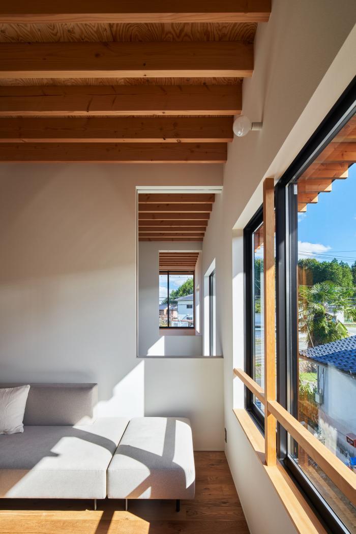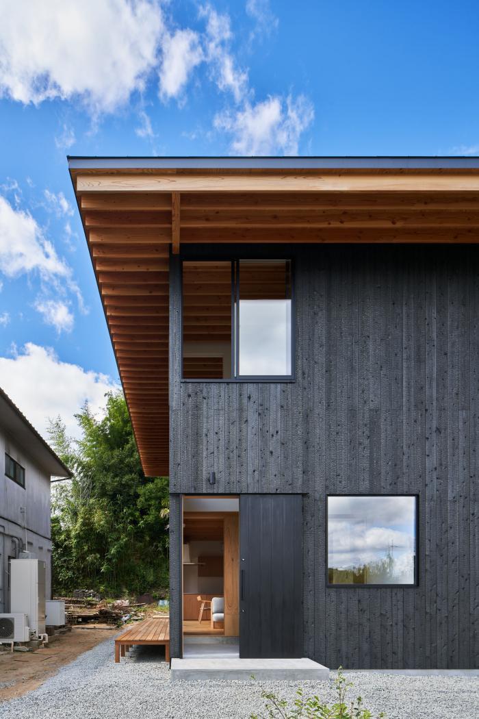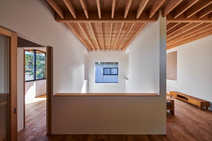 敷地は広島県三原市中心部から車で30分ほどの山間にある。東側はこの地域を南北に抜ける道路に面し、南側に祖母と両親が暮らす母屋、西・北側には竹林を背負う。離れて暮らす夫婦が、ご主人の生まれ育ったこの土地に戻り、祖母・両親と一緒に暮らすための2世帯住宅の計画である。施主からは「1世帯住宅の延長線上にある2世帯住宅」を求められた。2世帯住宅を設計する際には”世帯間の分け方”が課題となるが、家族の形態は10年、20年という時間単位の中で変化していく。その変化に対して包容力を持った器として機能する住宅を目指した。外観は、自然に囲まれたこの土地で周囲に呼応しながらも堂々とした建ち方とするために、生活空間を収めたボリュームの上に深い軒を持つ平らな大屋根を掛けたシンプルな形としている。内部は1階に家族共有のLDK・水廻りと親世帯の寝室を配置し、2階を子世帯のスペースとしている。家族の仲が良く、1階のLDKに全員が集まることが多いため、LDKを中心としながら吹抜や引戸の開閉により自分たちで全体に多様な繋がりを作ることが出来る構成とした。また、内外壁、天井高、吹抜、軒下空間などのエレメントを通常の住宅スケールよりも大きく用い、世帯間あるいは部屋と部屋の間で「共有」させることにより、一見すると単純な構成ながらも、どの部屋が何の用途なのか、2世帯住宅なのかどうかさえもはっきりとしない「不透明」な状態を作っている。ひとつひとつのエレメントのスケールを大きくすることで大らかさの中に距離感や拡がりが生まれ、エレメントを共有することで全体に繋がりが生まれている。ひとつの屋根の下で暮らす家族としてのまとまりを持ちながら、様々な変化に対してフレキシブルに対応出来る住宅となった。