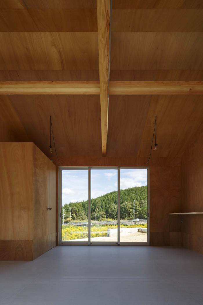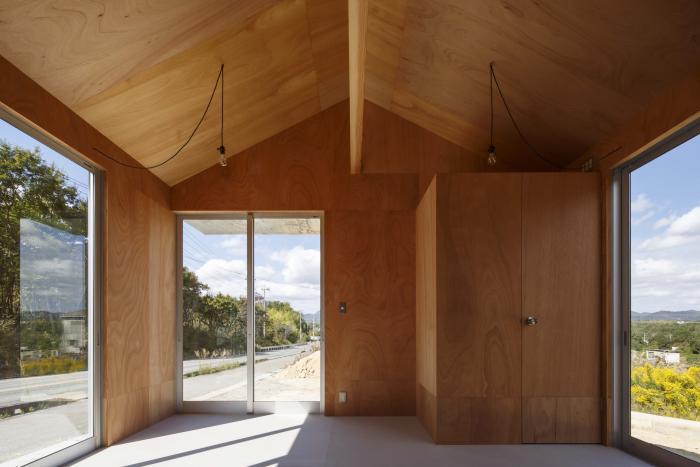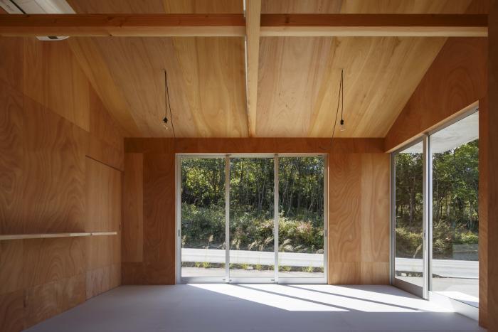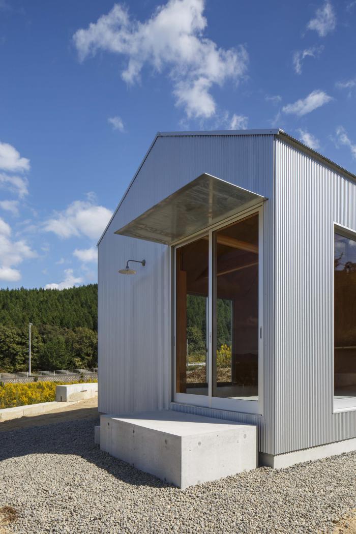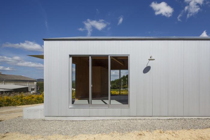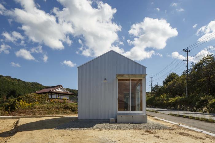 東広島市南部の山間へ新築した厨房を持つテイクアウト式の店舗。敷地は市街化調整区域内に位置するため周囲にはのどかな風景が広がり、街中よりもずっと空が大きく見える。初めて敷地を訪れた時、主役としての建築ではなく、風景や暮らしの中で黒子として佇む建築を作るべきだと考えた。外観は周辺の山並みとの調和に配慮して切妻屋根とし、外壁と屋根を素地のガルバリウム鋼板の波板で仕上げることで、時間や四季で変化する色・木々の影と緩やかに呼応させる。内部は販売スペース・トイレ・キッチンによるシンプルなプランだが、”テイクアウトのみ”という条件を活かして各々の面積を営業に支障の無いミニマムなサイズとし、それらを組み合わせた細長い長方形平面とすることで建物全体の大きさを抑えながら内外の距離を近付けている。見た目も機能も小さな建築だが、風景や生活の一部として欠かせない存在となることを願っている。