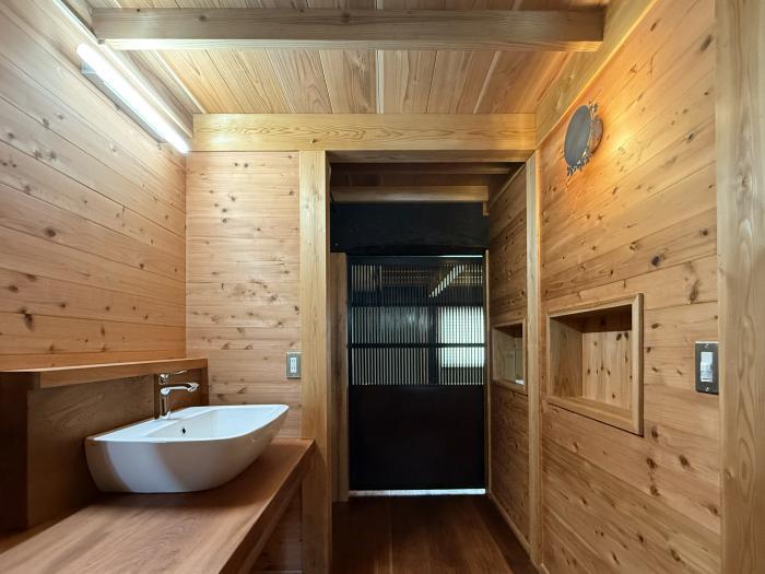 壁には島根の石州瓦タイルを張っている。床は無垢の3cm厚の杉板。