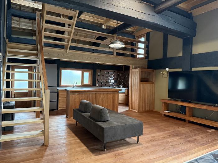 120年前の古材と新材による屋根構造や壁仕上げを組み合わせて、伝統的な材料や技術を使いつつも新しい印象の家になるように設計しました。
