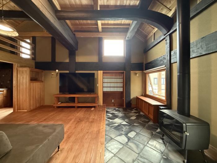 玄関ドアは蔵の戸を利用し、薪ストーブのある土間が続いている。