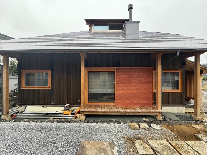 南西側外観。外壁は土壁の上に鉄媒染により着色した杉板を張っている。