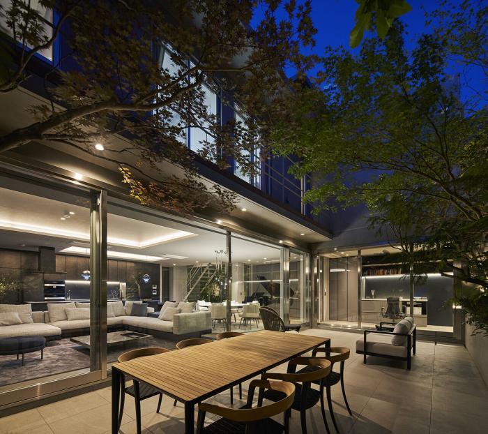 外部に対しては視線と音を丁寧に制御し、内部に向かってひらく構成とした点が特徴です。中庭を住まいの中心に据え、どの空間からも光や風、空の気配を感じられるよう計画しました。また、開口の高さや奥行き、天井の抑揚を操作することで、視線の抜けや陰影に変化を生み、限られた敷地の中でも豊かな広がりを演出しています。さらに、内外の境界を曖昧にする素材とディテールにより、日常にささやかな非日常性を織り込んでいます。