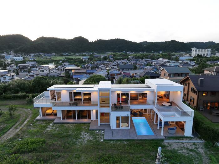 海辺の住宅地にありながら、日常を離れた滞在の時間をもたらす別荘。建物は水平に広がる構成とし、複数のテラスと水盤を介して内外がゆるやかにつながります。各室は外へとにじみ出るように配置され、光や風、海の気配を深く取り込む計画としました。周囲に開きながらも視線を丁寧にコントロールし、プライバシーと開放性を両立。夕景には灯りと水面が呼応し、滞在するように過ごす豊かな時間を生み出します。