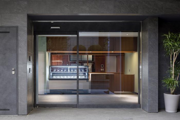本プロジェクトはいわゆる居抜きの店舗であり、外壁タイルやドアが形づくる黒系統のファサードに内装のトーンを合わせていく必要があった。加えて、商品である冷菓の印象や求められている落ち着いた雰囲気を手掛かりに検討する中で、自然と彩度やトーンを抑えた空間イメージが立ち現れた。