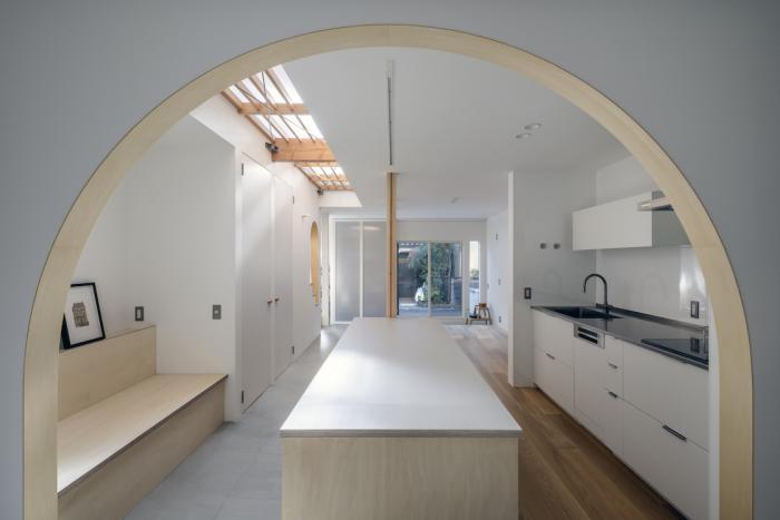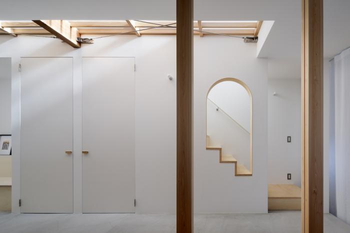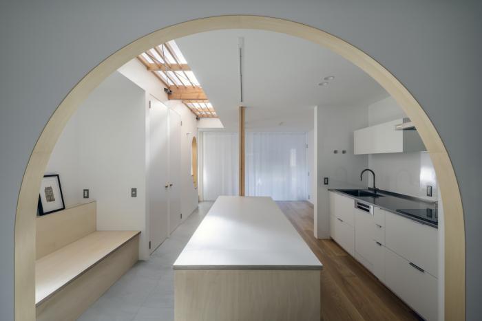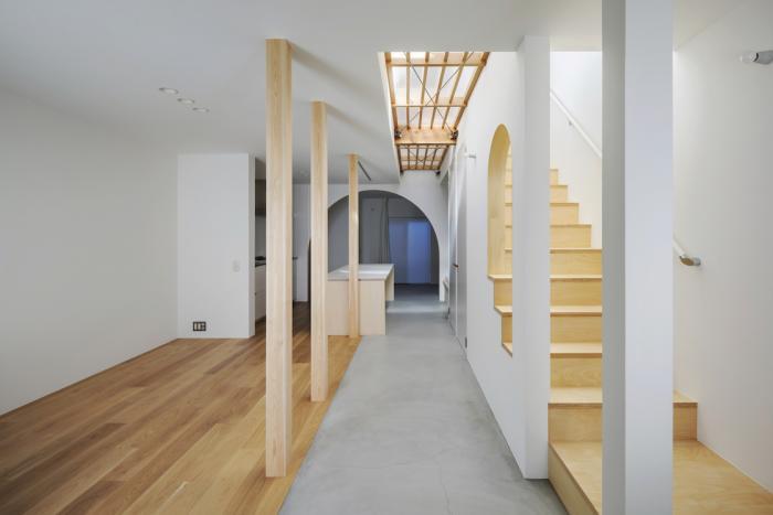 ワンルーム構成である1階全体は、単調で間延びした印象とならないよう、アール垂れ壁や仕上げの切替えで緩やかにゾーン分けを行い、また機能や居場所を散りばめることで拠り所のある空間となるよう企図した。