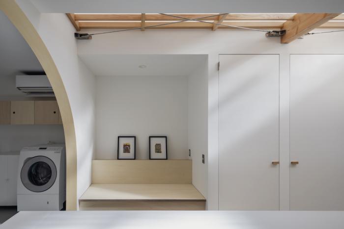 1階には南道路に面した大窓があるが、プライバシーの観点から居室と少し距離が欲しい。そこで窓と居室の間に縁側のように土間空間を設け、居室側と窓双方にカーテンを設置することで、光や視線の調整のみならず、縁側、居室の一部、玄関の延長など、用途の編集を受け入れられる空間とした。