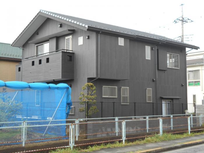 川からの姿。突き出しはユーティリティー。水色のネットは隣地のブルーベリーの養生。