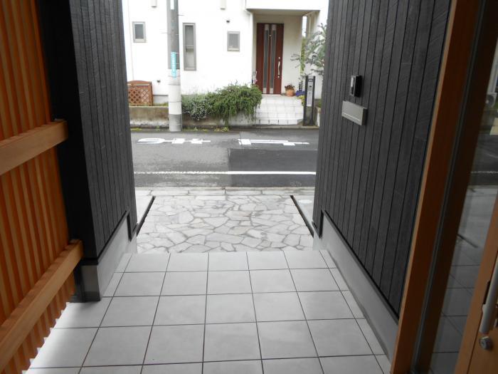 玄関ポーチより道路を見る。風通しが良く。玄関脇の下窓を開けると風が入ってくる。