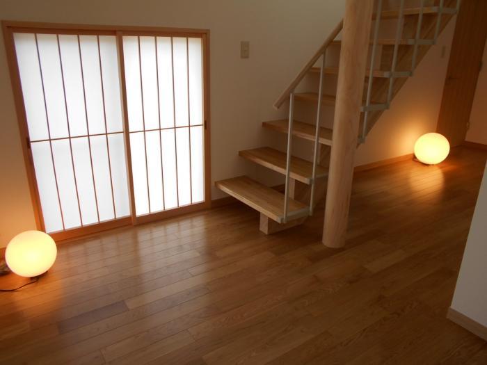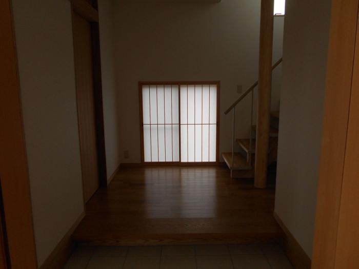 ポーチから玄関に入る。正面には下窓の障子が階段の足元を明るくする。昼行燈。