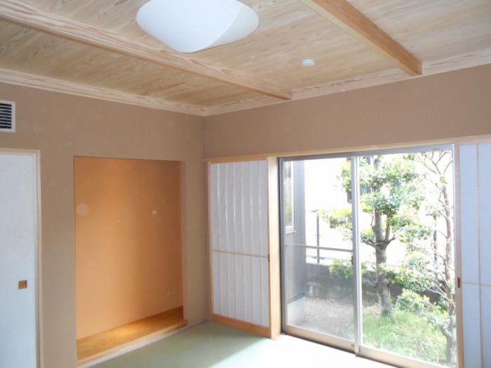 床の間は奥行きの少ない蹴込み床とし、天井も杉柾の竿縁仕上げ、壁珪藻土塗仕上げ。