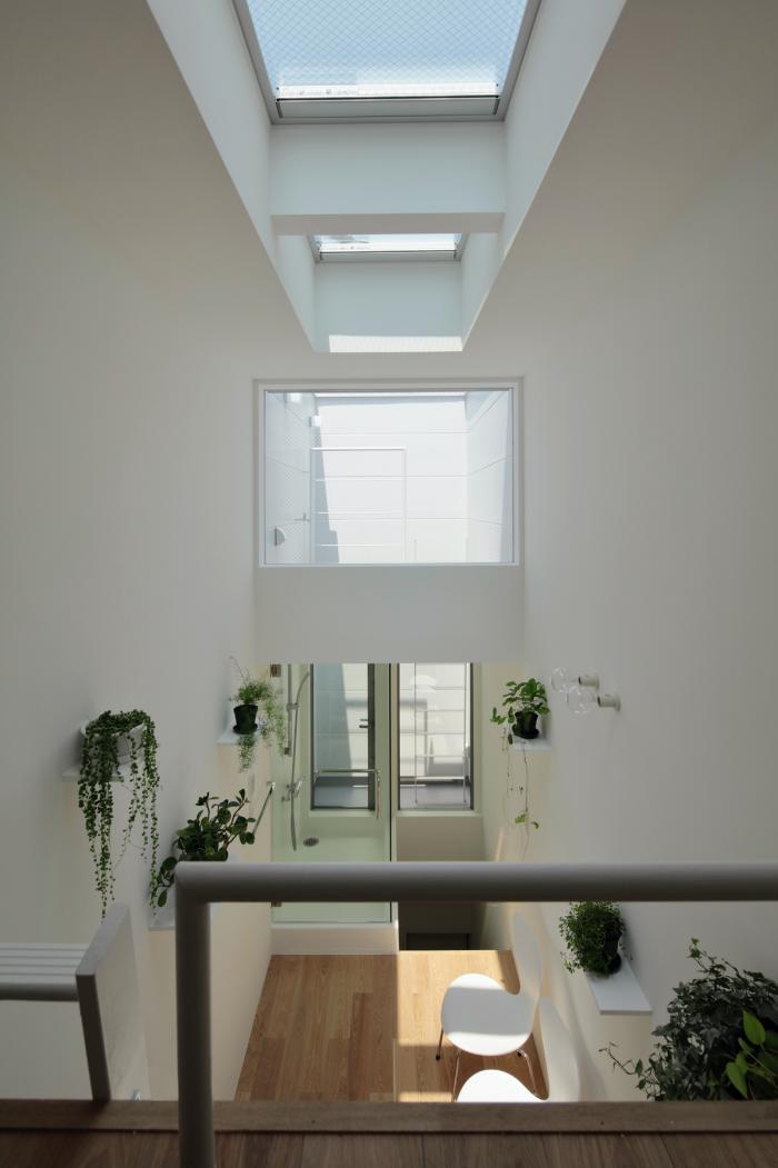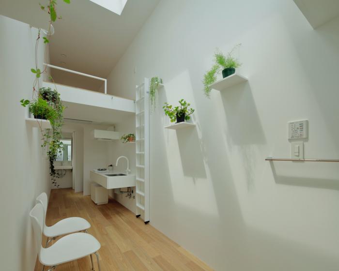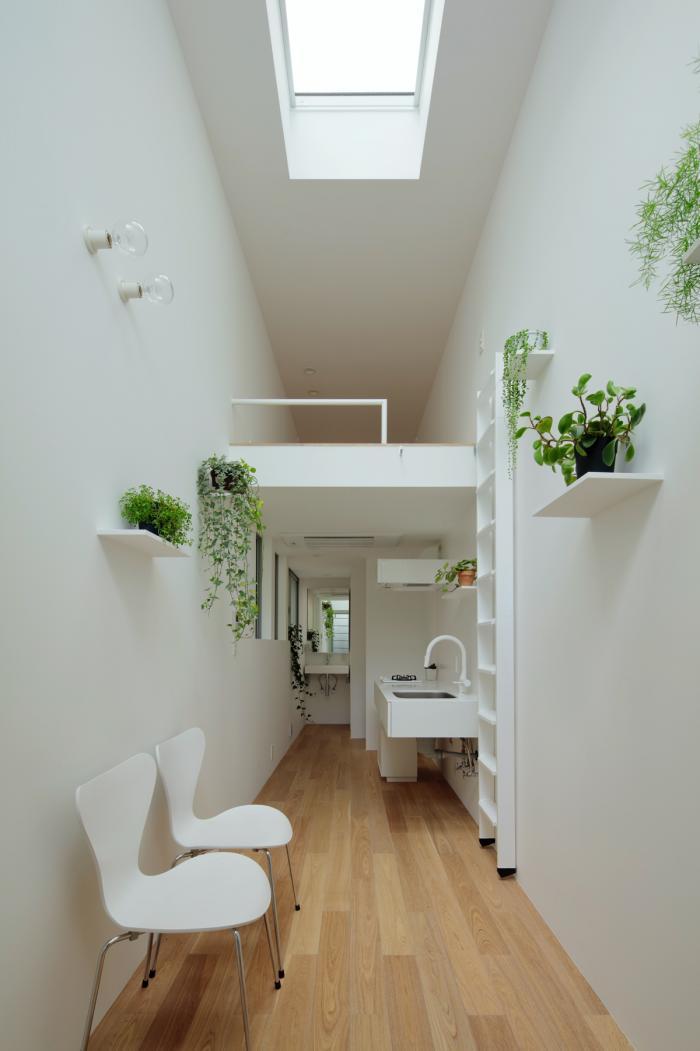 東京の下町。袋小路の路地のような間口が狭く奥行のある敷地に建つ重層長屋形式の賃貸併用住宅です。建物の間口は1間(1.82m)。1、2階それぞれにロフトを設けることで天井の高い住戸を上下に二つ積み上げたような長屋です。施主夫婦は2階に住まい、1階を賃貸住宅としています。敷地の間口は細いところで2.4m、広い場所でも2.7m程度しかありません。そんな空間をすっと切り取るように壁を立てて生まれた場です。両サイドを高い壁に囲まれた室内は、壁に付加された植栽の雰囲気とも相まって、まるで街路の一部であるような内外が不確かな場所になります。そこでは路地に入ったときのような独特の心地よさを感じることができます。それは、きっとこの場所でしか享受できない体験です。それまで目を向け活用されることのなかった下町の隙間のような凡庸な敷地を、シンプルな手法でゆたかな人の営みの場所に変えたいと考えました。