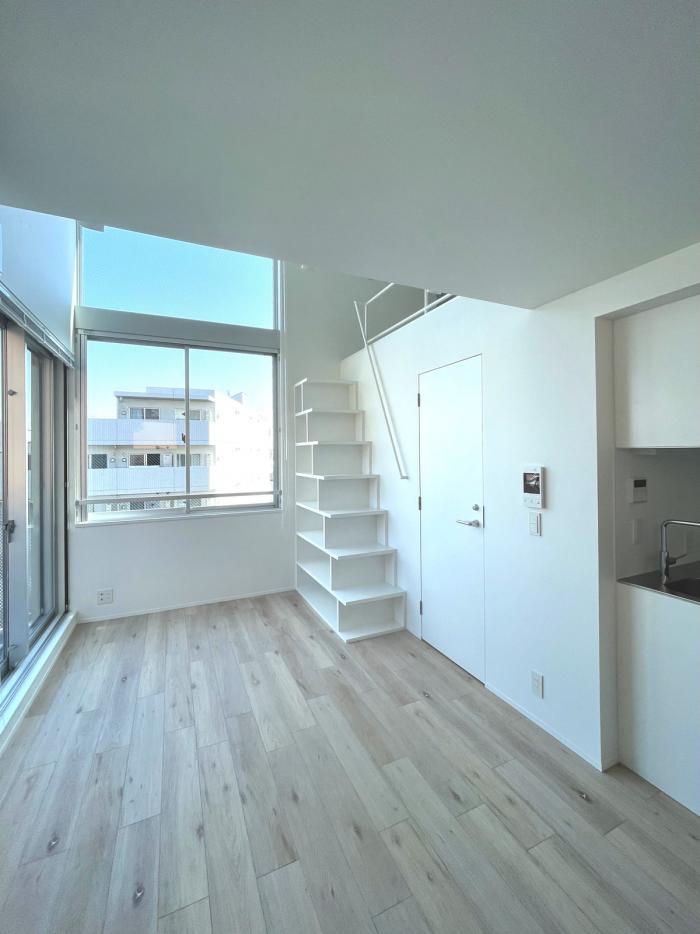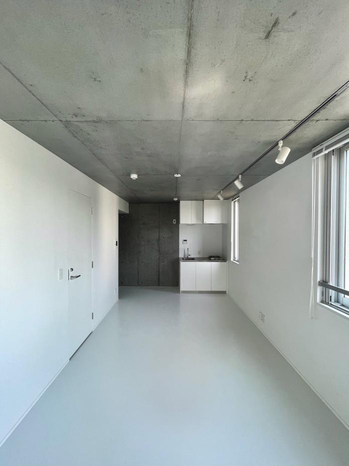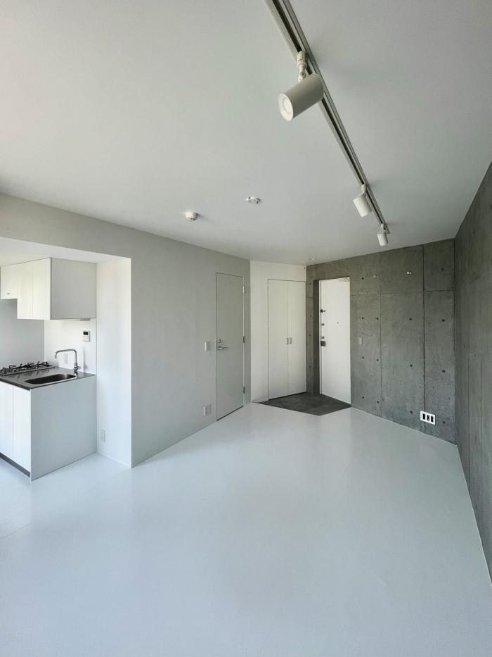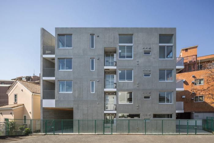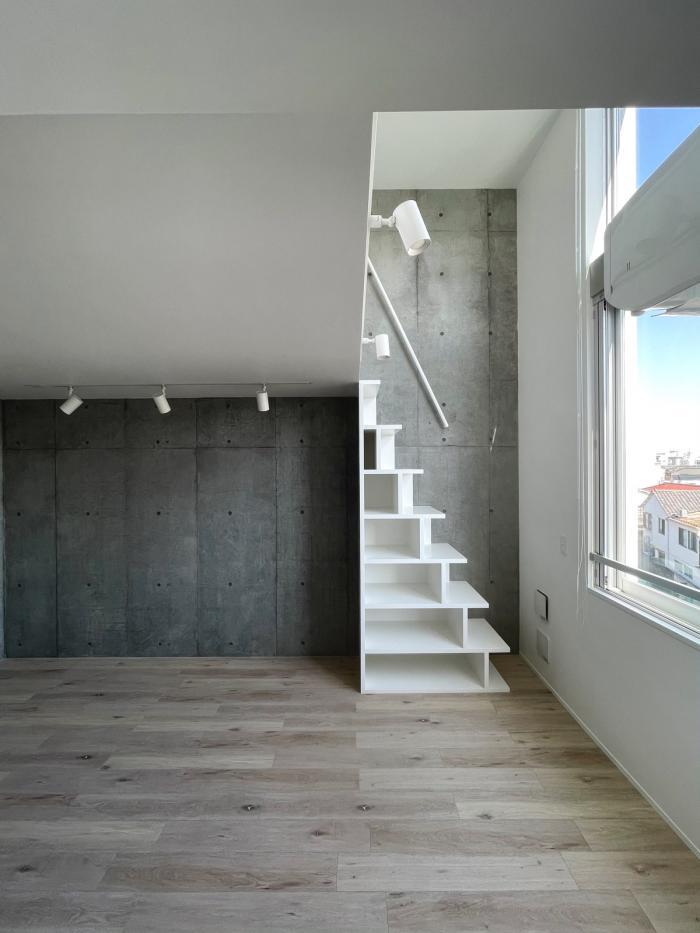 東京都目黒区に建つ賃貸用共同住宅。多様な文化やライフスタイルが混ざり合う地域にあって、住まい手に合わせて柔軟に様相を変化させていくプレーンで寛容な空間を作りたいと考えました。同時に、スキップフロアの断面構成や三角形の敷地に呼応した平面形状など、事業用物件として収益性を最大化するための効率的な空間活用も実現しています。