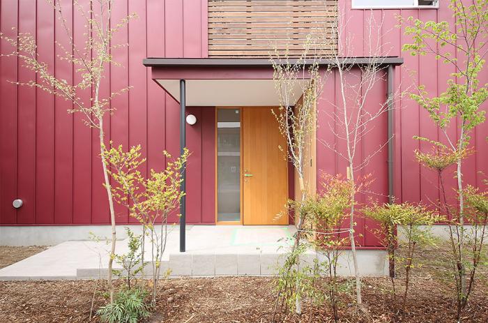 赤いガルバリウム鋼板の縦ハゼ葺きと白いラスモルタルリシンのコンビネーション。