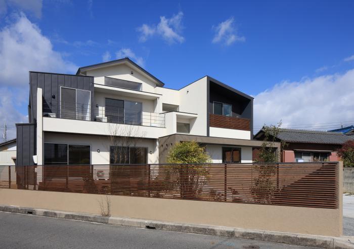 完全2世帯住宅・スキップフロア(メザニン・中二階)・2世帯共用の間・クルマ3台・趣味の間・螺旋階段・LOFT・地域産材料等様々な要素が組み込まれた、シンプルモダンな住宅です。 |