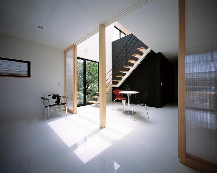 最寄り駅から歩いて5分ほどの閑静な住宅地の20坪に満たない狭小地に建つ木造三階建ての住宅です。 |