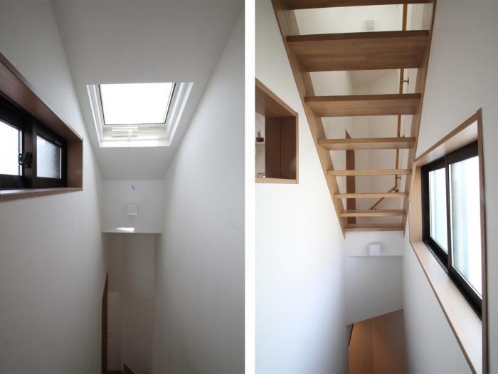 スケルトン階段(蹴込み板が無い階段)とする事で、猫は、窓枠→階段の裏側から階段の踏み板に乗る、など猫独自の動線が出来、上下に楽しく動いています。