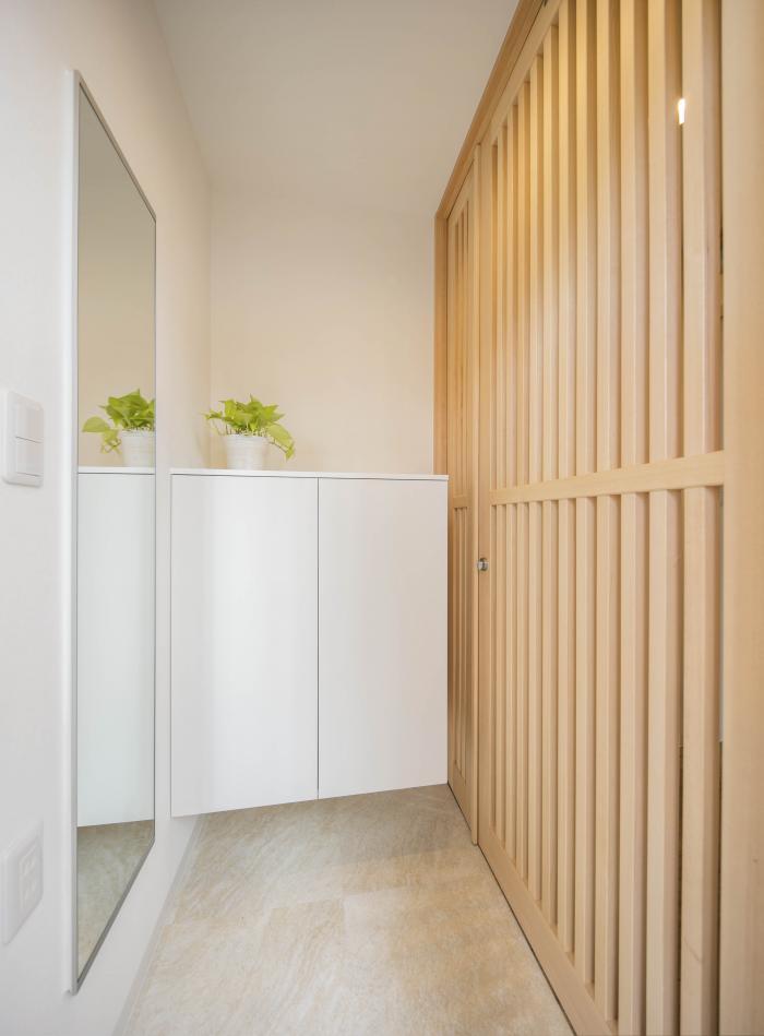 猫が外に飛び出さない様、玄関扉と玄関ホールの間に、木格子の扉をつくり、外から帰ってきた時に玄関扉を空けても猫が出て行かない様にしています。