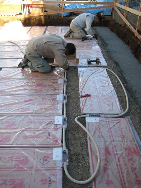このシステムは、耐圧コンクリートの下にパネルヒーターを敷き込み、深夜電力を使いつくった熱をコンクリートと土に蓄熱させて夜に限らず、昼間の暖房もまかなうというものです。