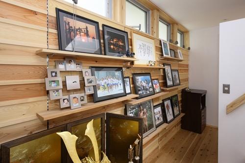 写真は玄関ホールの一面だけに木をあしらった事例です。ここではこの家に仕上げ材として使用している木に限定し3種類の木を採用しました。