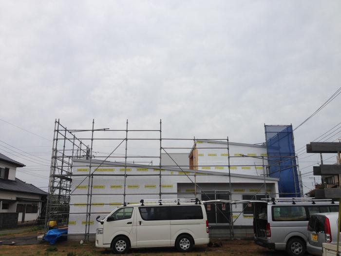 現場は、屋根が葺かれ…テラスの防水がされ…サッシがほとんど取り付けられ…頗る素晴らしい進行状況(≧∇≦)渡辺さんはじめ現場のみなさんに感謝感謝感謝!クライアント奥様もお茶の差し入れと共にいらして頂き…現場をご案内…ありがとうございます!今日は電気やさん、サッシやさんとも初のご対面…宜しくお願い致します(*^^*)