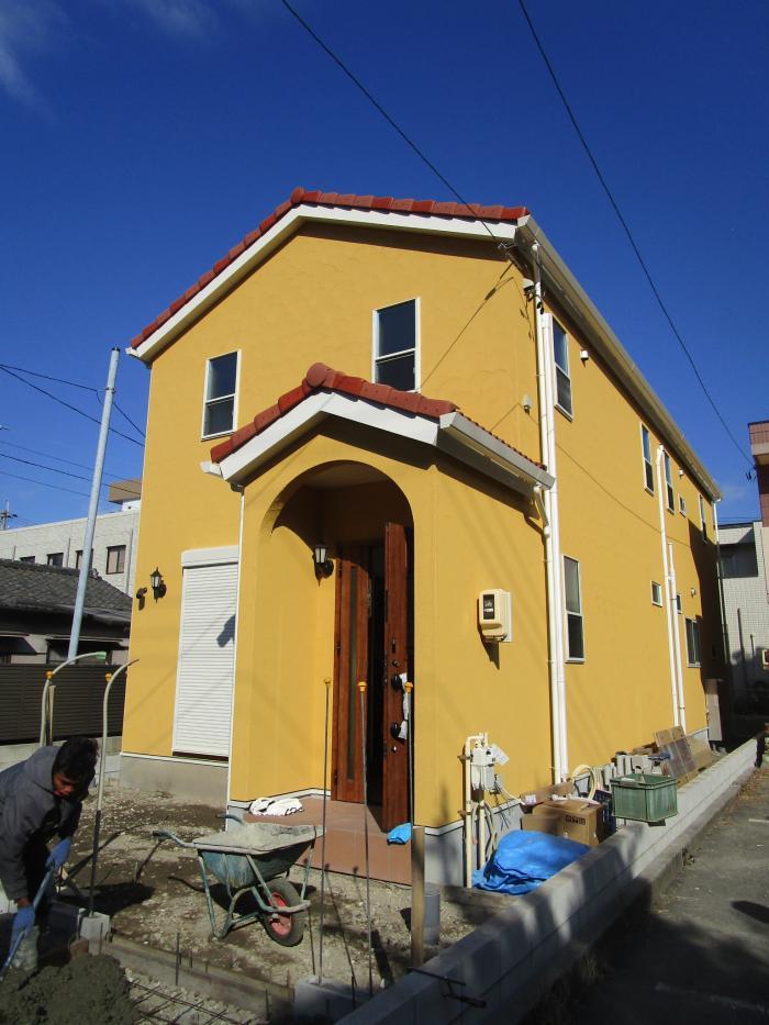 山吹色の塗り壁に、オレンジ色の洋瓦が印象的な、南欧風 外観です。