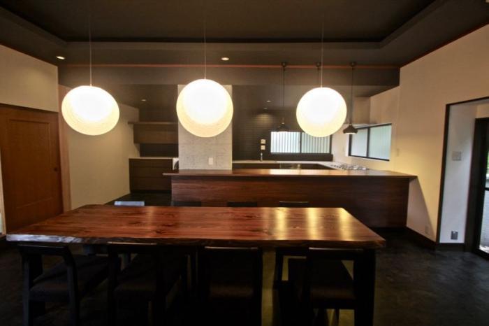 アイランドキッチンおよびダイニングテーブル、イスは、家具工事として製作しています。
