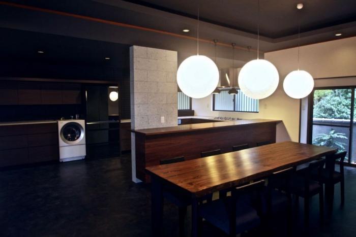 内装は黒色を基調として、キッチン、テーブルの素材も統一感を出しています。