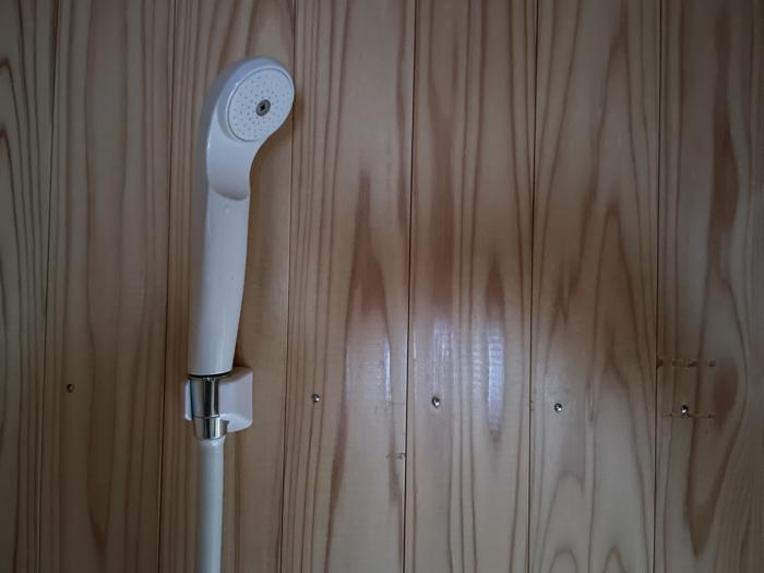 浴室の杉板は真鍮の丸頭釘です。板の反り防止ですが、昔から定番の見せ釘です。