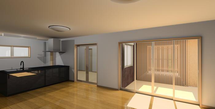 ※現在居住中の住まいに対して計画的に増築する事でLDK側に中庭をつくる余白のウッドデッキ空間と格子による陰翳を愉しむ空間に提案