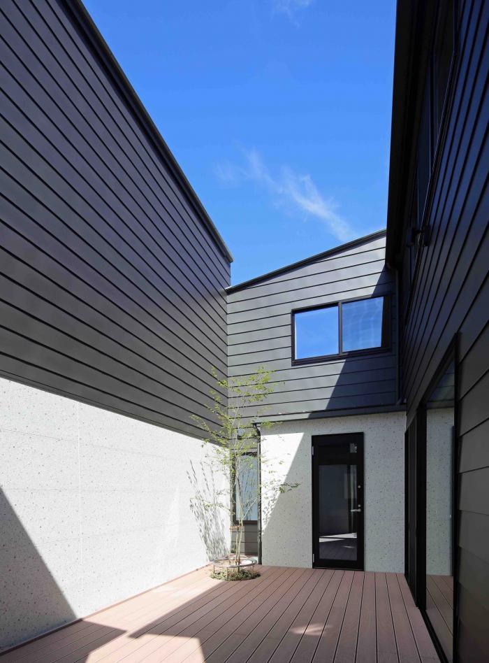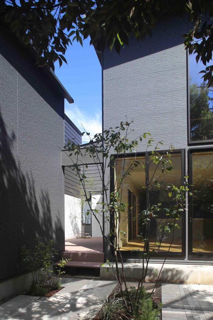 【フラッツ FH】は2住戸からなる集合住宅です。各住戸でピアノが弾けるようなグレードをめざし、視線はもとより、音や響きも相互に伝わらないように、 両者を分断しつつ、わずかな箇所で接するような配置計画としました。 それぞれの家の外形を組み合わせることで、 中庭や、プライベートな庭空間を生み出しています。 内部では吹抜を中心に開放的な住空間を展開しました。