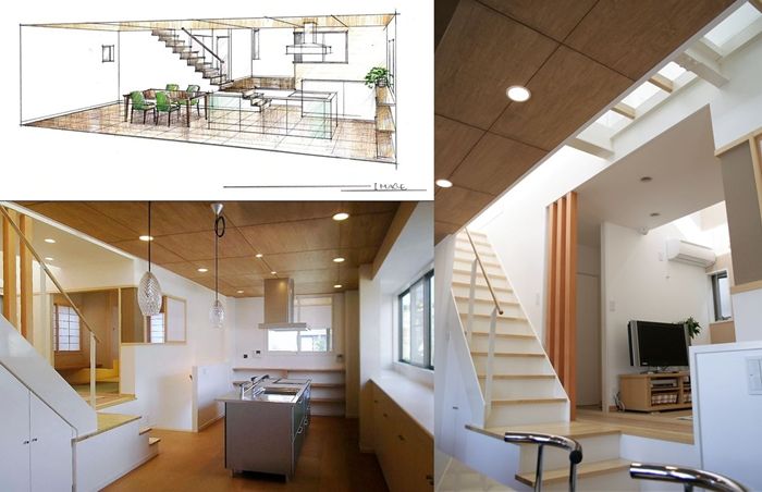 スキップフロアーは過去にいくつかやらせていただきました。カッコよさやインテリアデザイン的な意味はもちろんのこと、それプラス、あとで段差による不自由だけが残るという結果にならないよう、毎日の生活を通した目的や趣旨をよく話し合い、設計提案させて頂いています。