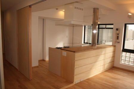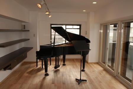 京都市内のマンションの、防音スタジオ付住戸へのリフォームである。施主は以前から新しい生活と音楽の為の場所を探しておられたが、一般の新築マンションでは防音の為の備えが無く、空間の自由度も低い等の理由から、中古マンションを購入して思い通りの空間を造る事を決断された。