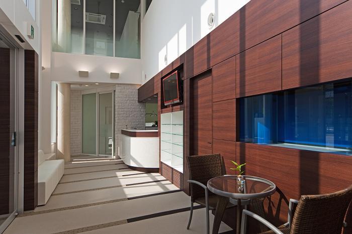 吹抜けの開放感ある待合室。壁には、水槽を埋め込んでおり、カラフルな魚達が出迎え、患者の緊張を和らげてくれる。