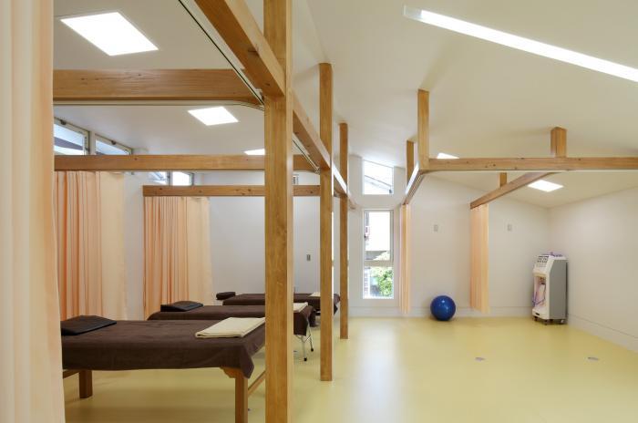 木造の柱と梁がそのまま各施術ブースの間仕切りとなっている為、カーテンレールや天井からのポールが無く、医療施設臭さを感じさせない空間となっている。(撮影:杉野 圭)