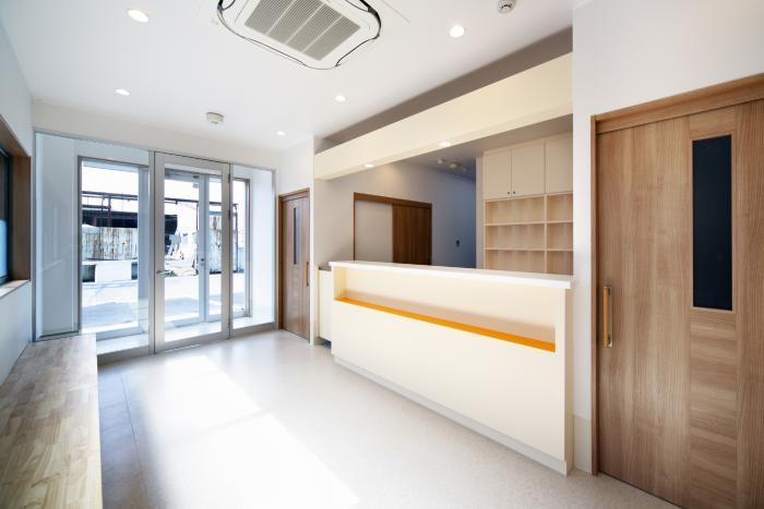 待合室を逆から見た所です。受付はシンプルにと言う要望がありましたので、白を基調にワンポイントだけカラーを入れました。