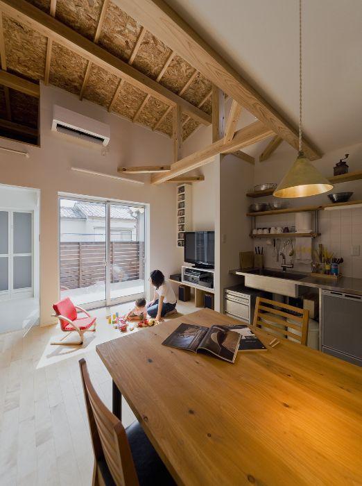 奥様のワークスペースなどが 一体となったワンルーム空間は無垢の杉の構造材をそのまま見せた 吹き抜け+メゾネット空間が実際の狭さを解消。
