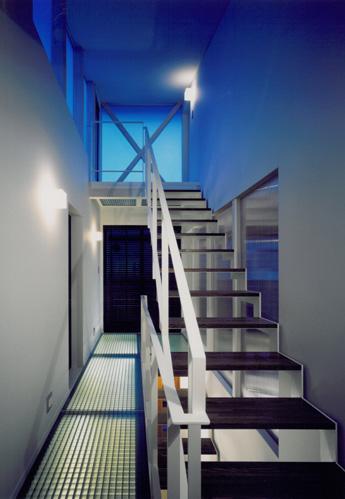 光が当たりにくい奥ばった旗竿敷地の住宅内部にペントハウスの 光が2階の格子床を通して