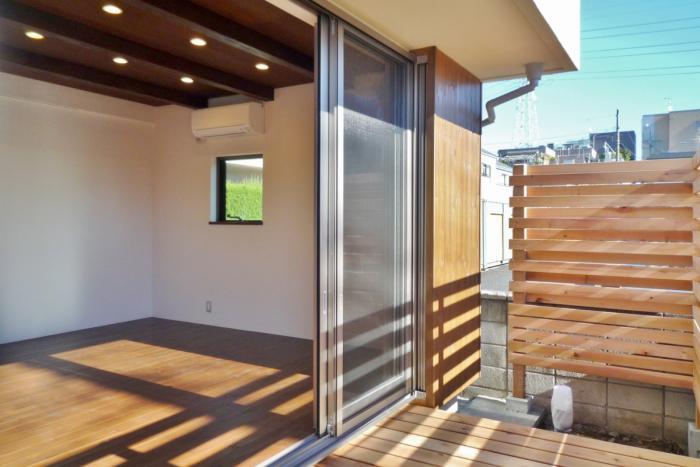 ウッドデッキは木製のフェンスによってプライバシーが守られ、大きな窓を開放することでリビングと一体的となるように計画しています。